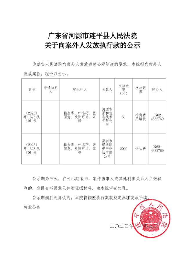 广东省河源市连平县人民法院关于向案外人发放执行案款的公示 11.6
