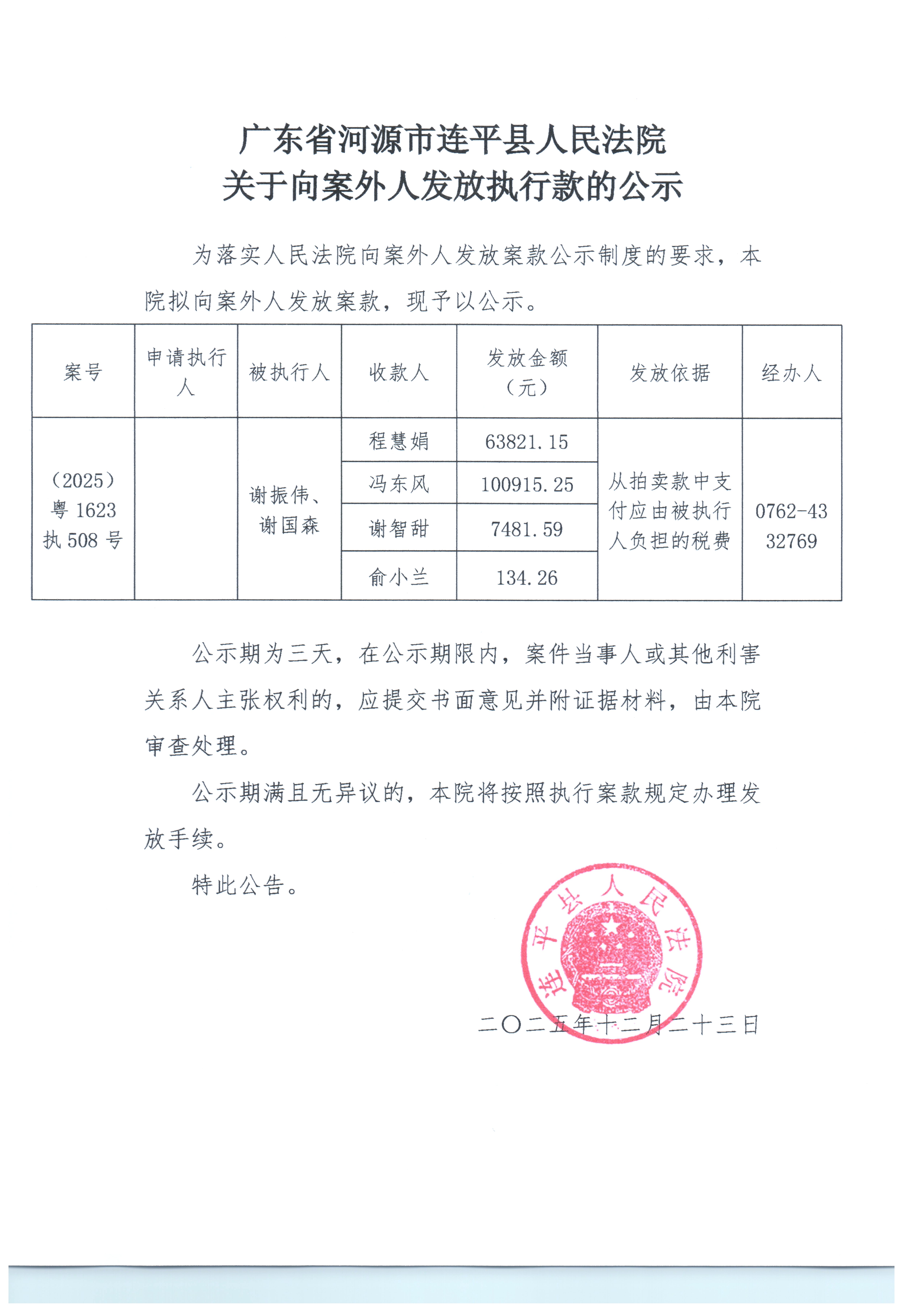广东省河源市连平县人民法院关于向案外人发放执行款的公示12.23