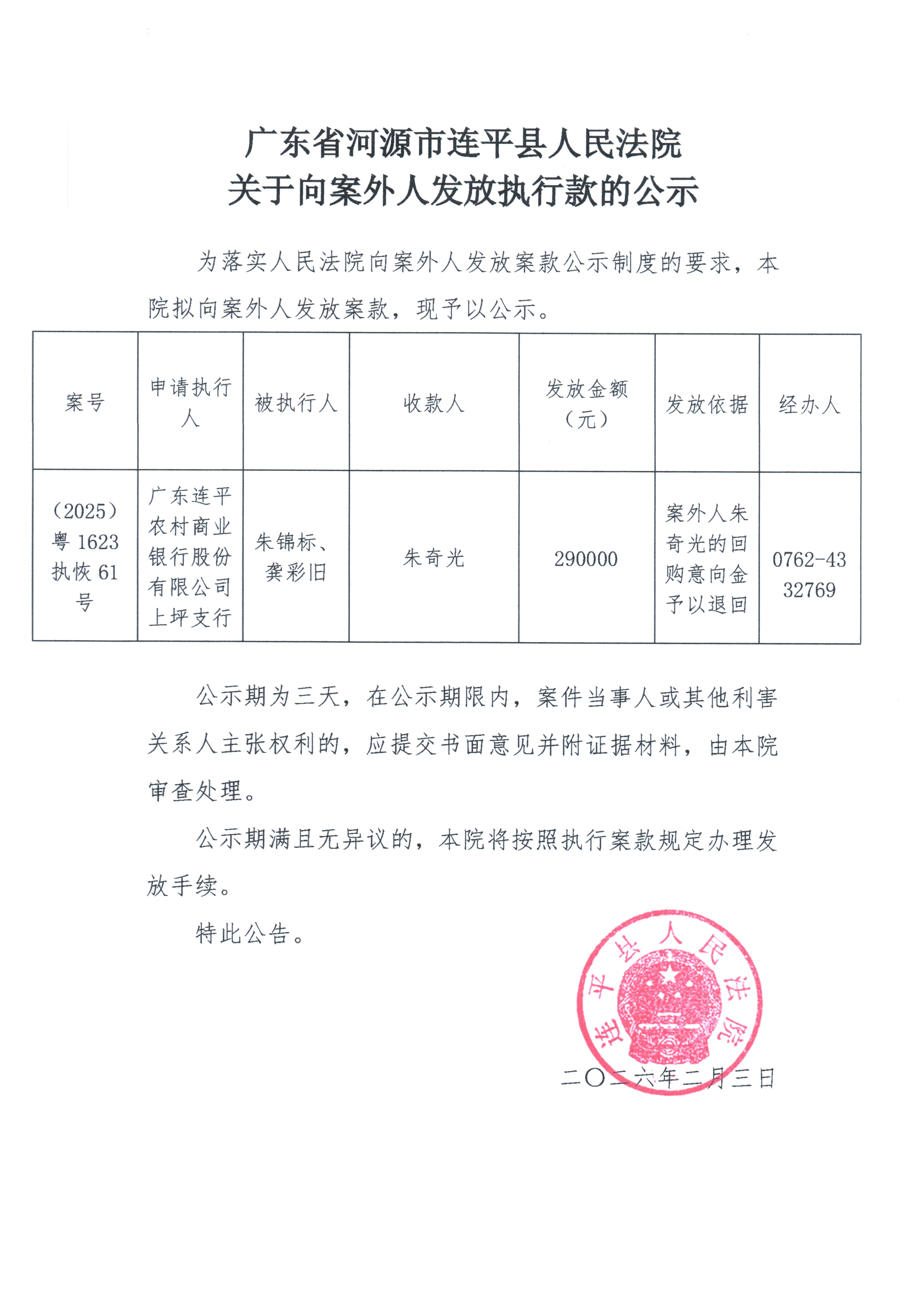 广东省连平县人民法院关于向案外人发放执行款的公示2.3