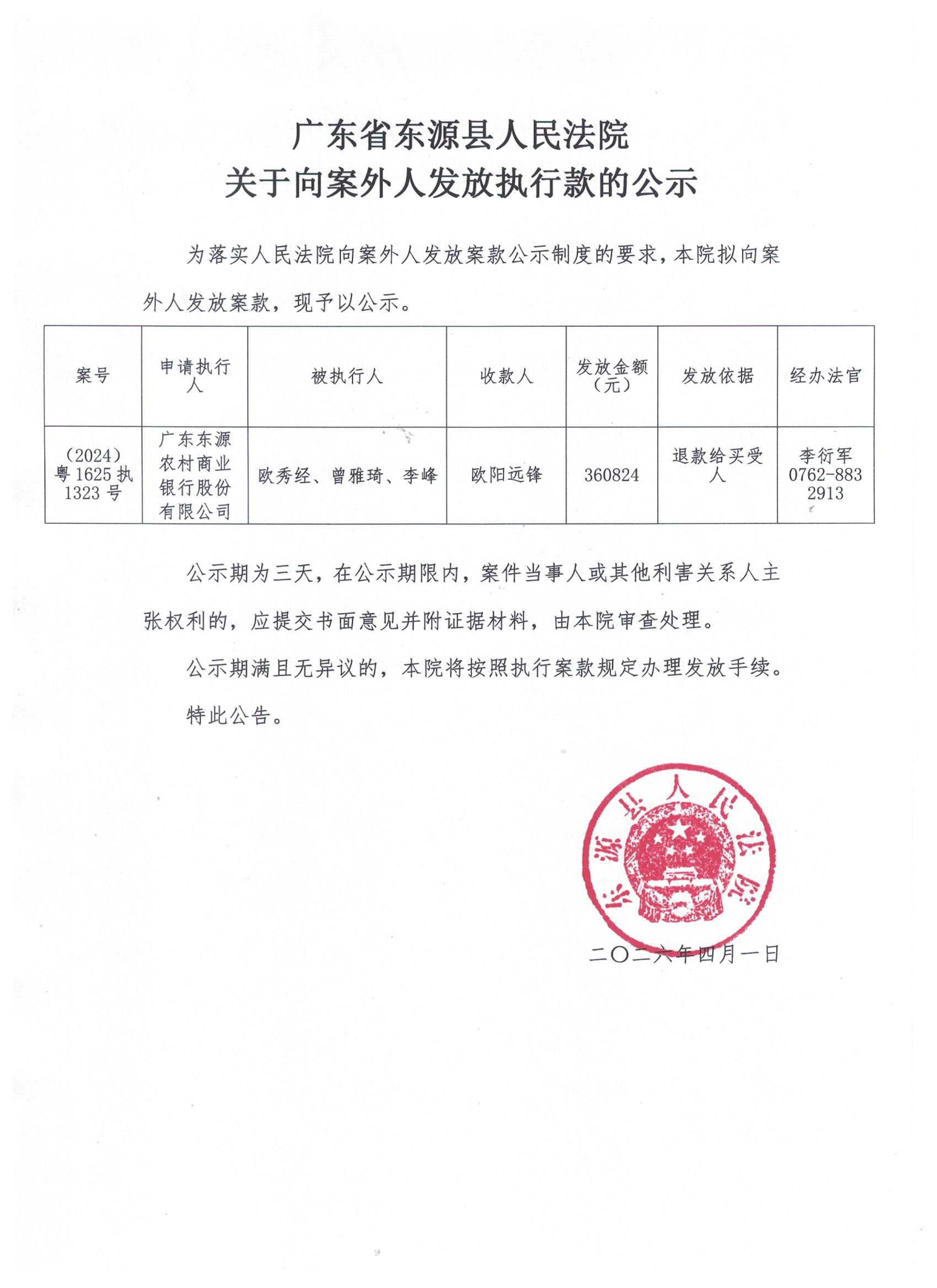 广东省东源县人民法院关于向案外人发放执行款的公示4.1