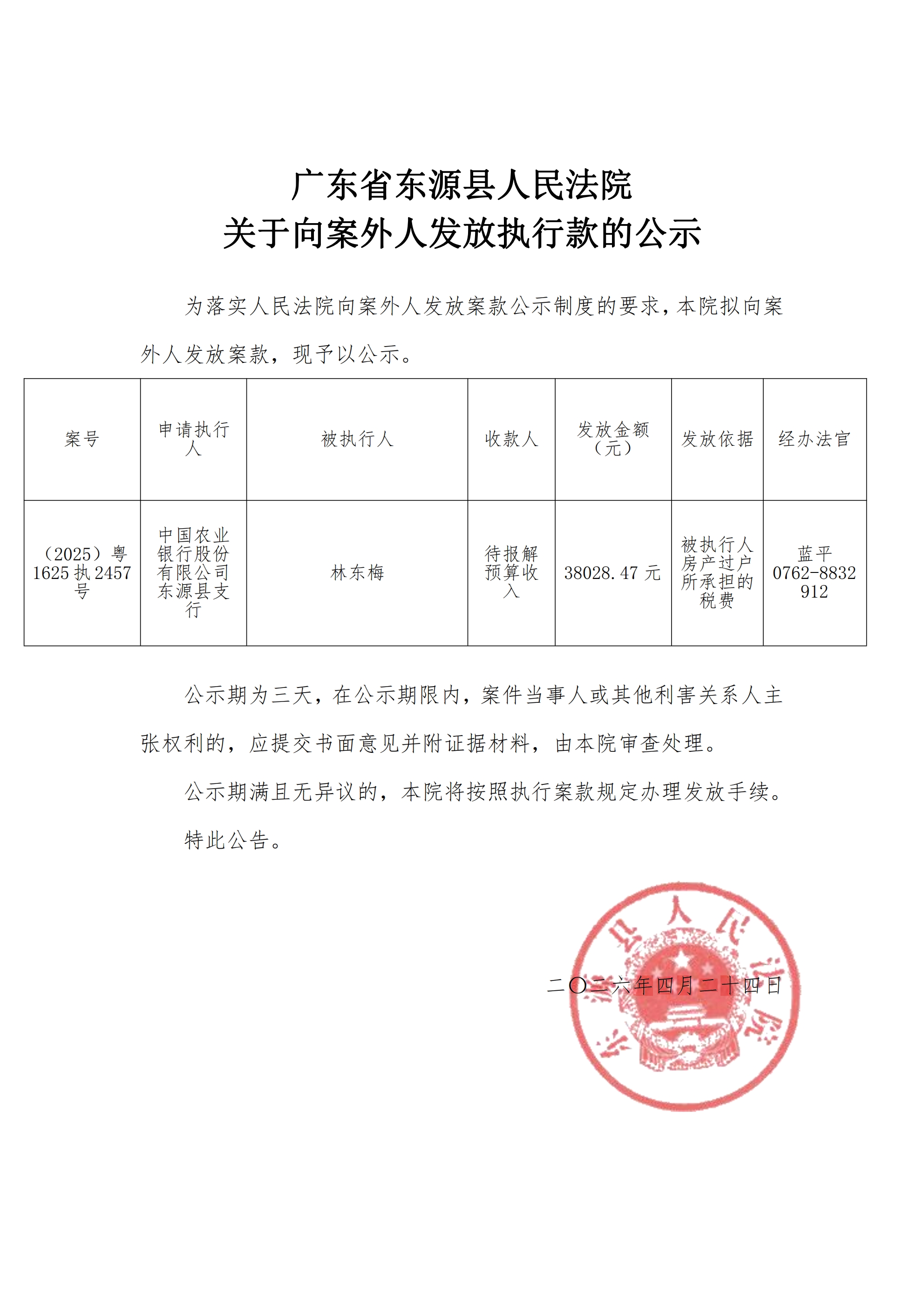 广东省东源县人民法院关于向案外人发放执行款的公示