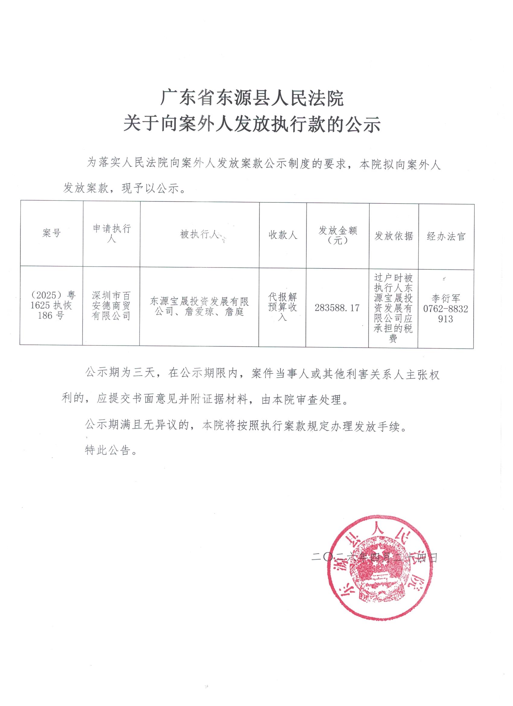 广东省东源县人民法院关于向案外人发放执行款的公示