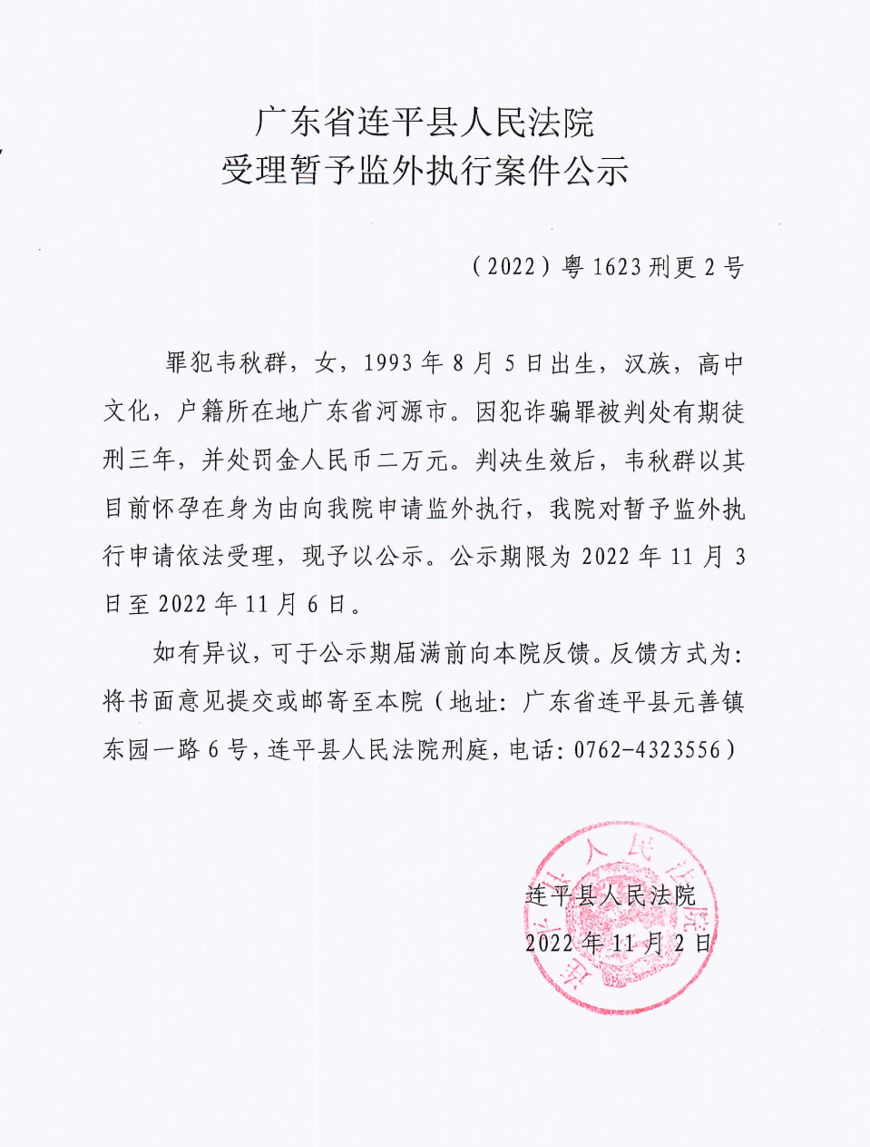连平县人民法院受理韦秋群暂予监外执行案件公示