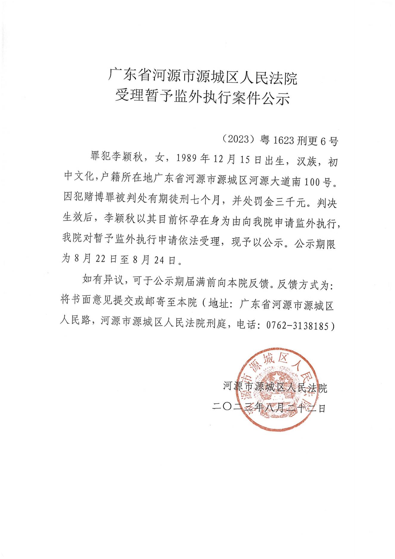 源城区人民法院受理李颖秋暂予监外执行案件公示