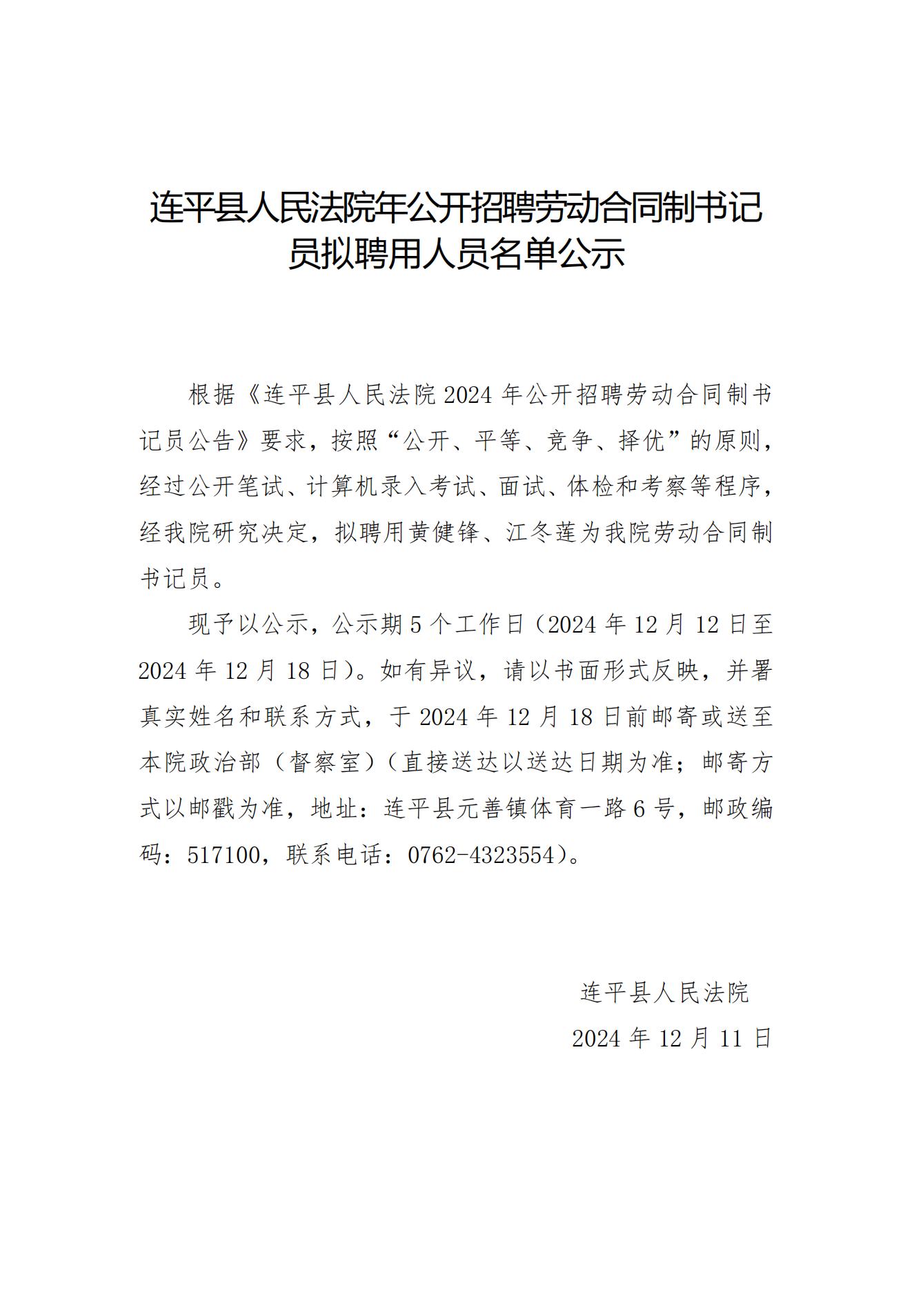 连平县人民法院公开招聘劳动合同制书记员拟聘用人员名单公示