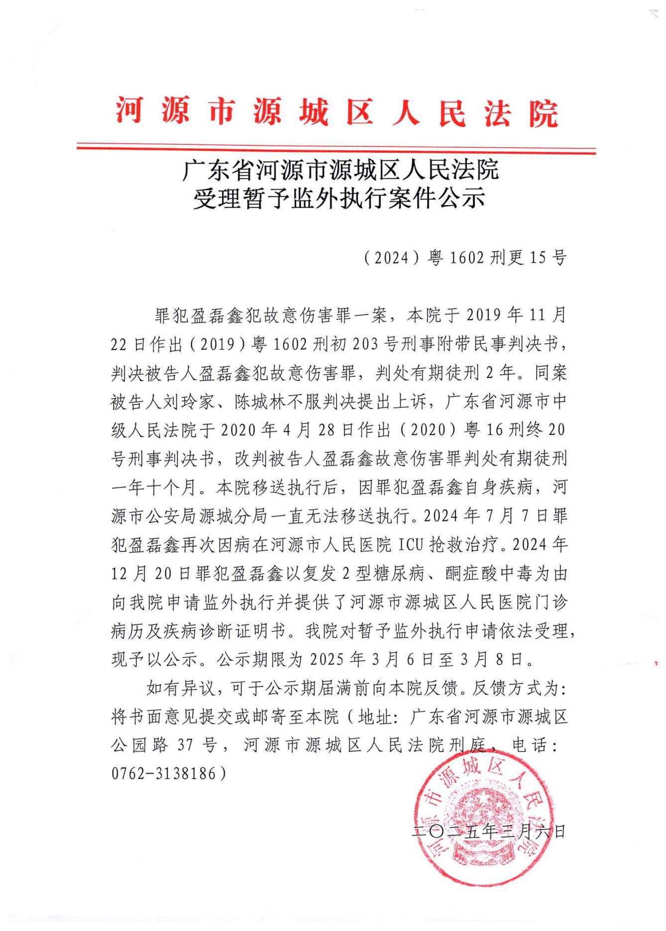 源城区法院受理暂予监外执行案件公示(盈磊鑫)