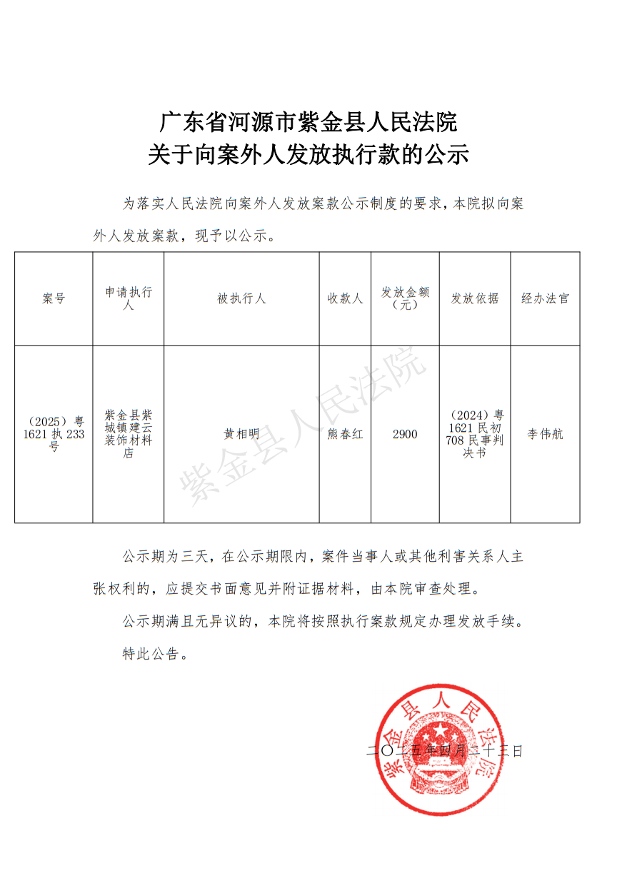 广东省河源市紫金县人民法院关于向案外人发放执行款的公示