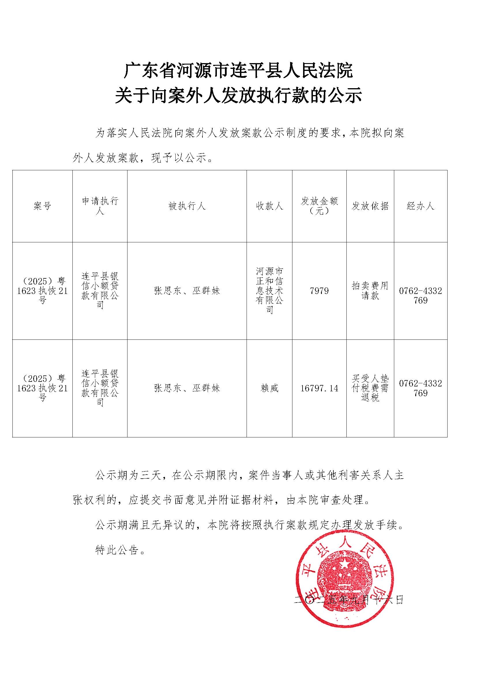 广东省河源市连平县人民法院关于向案外人发放执行款的公示9.16