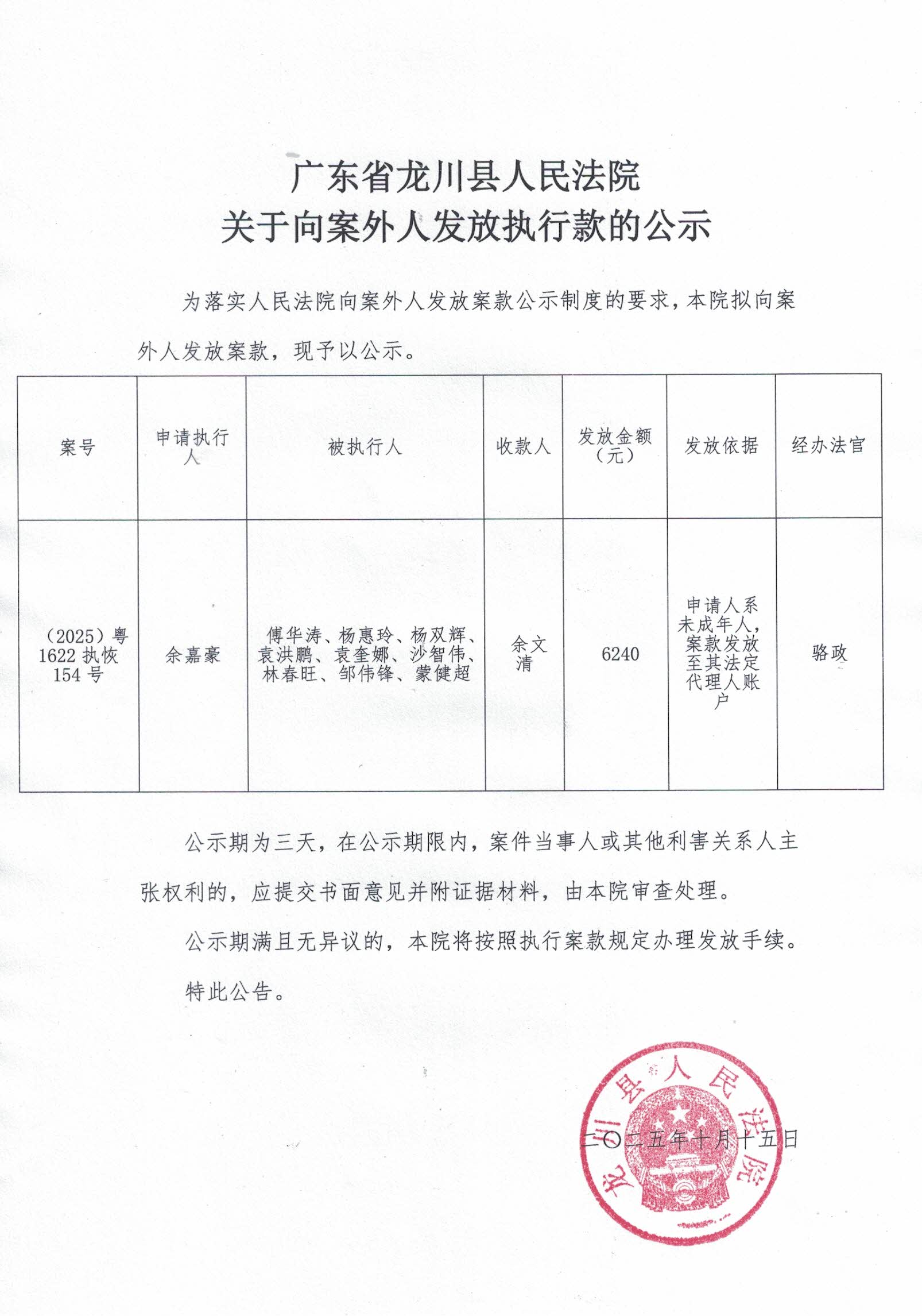 广东省河源市龙川县人民法院关于向案外人发放执行款的公示10.15