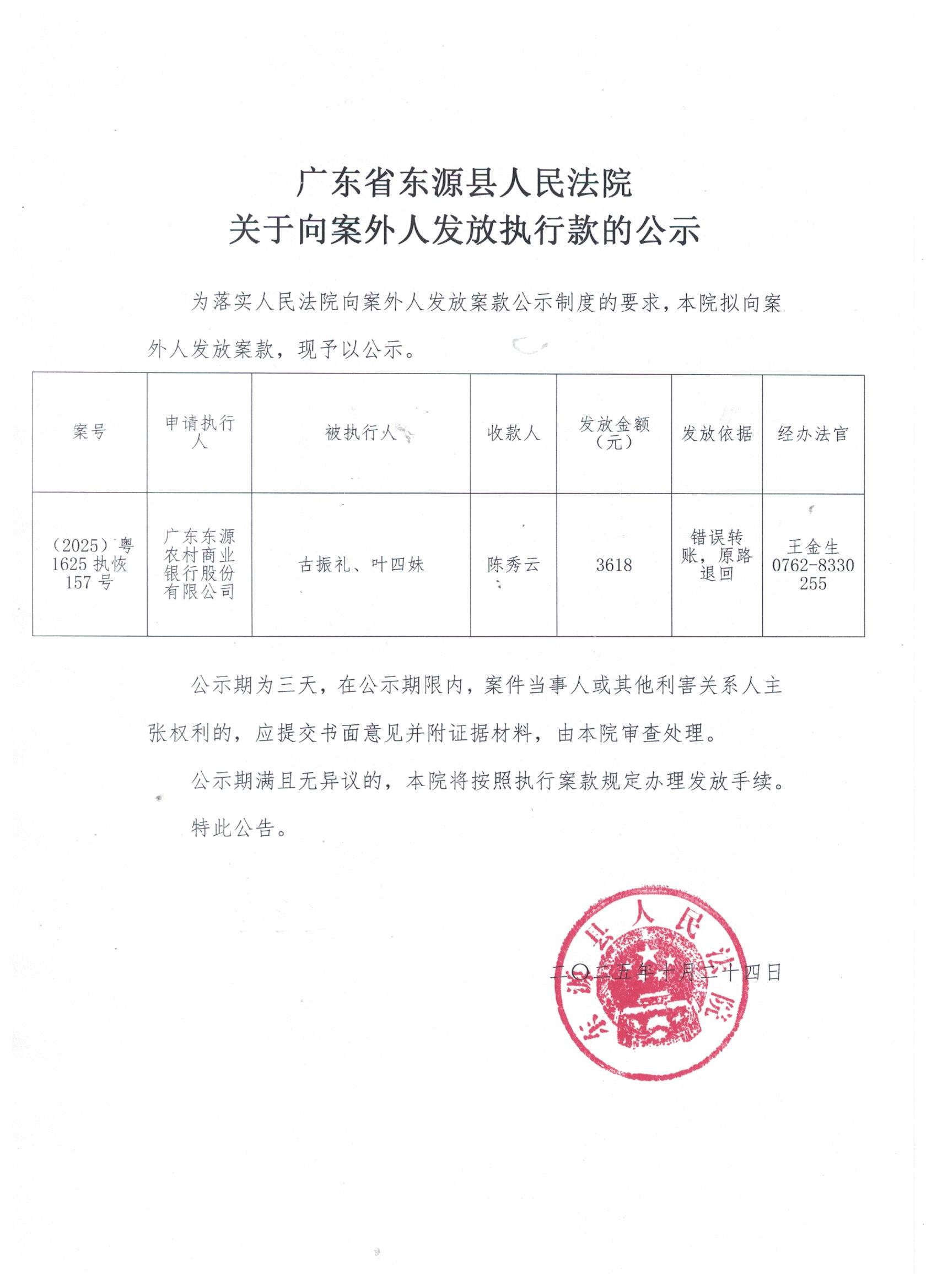 广东省河源市东源县人民法院关于向案外人发放执行款的公示10.24