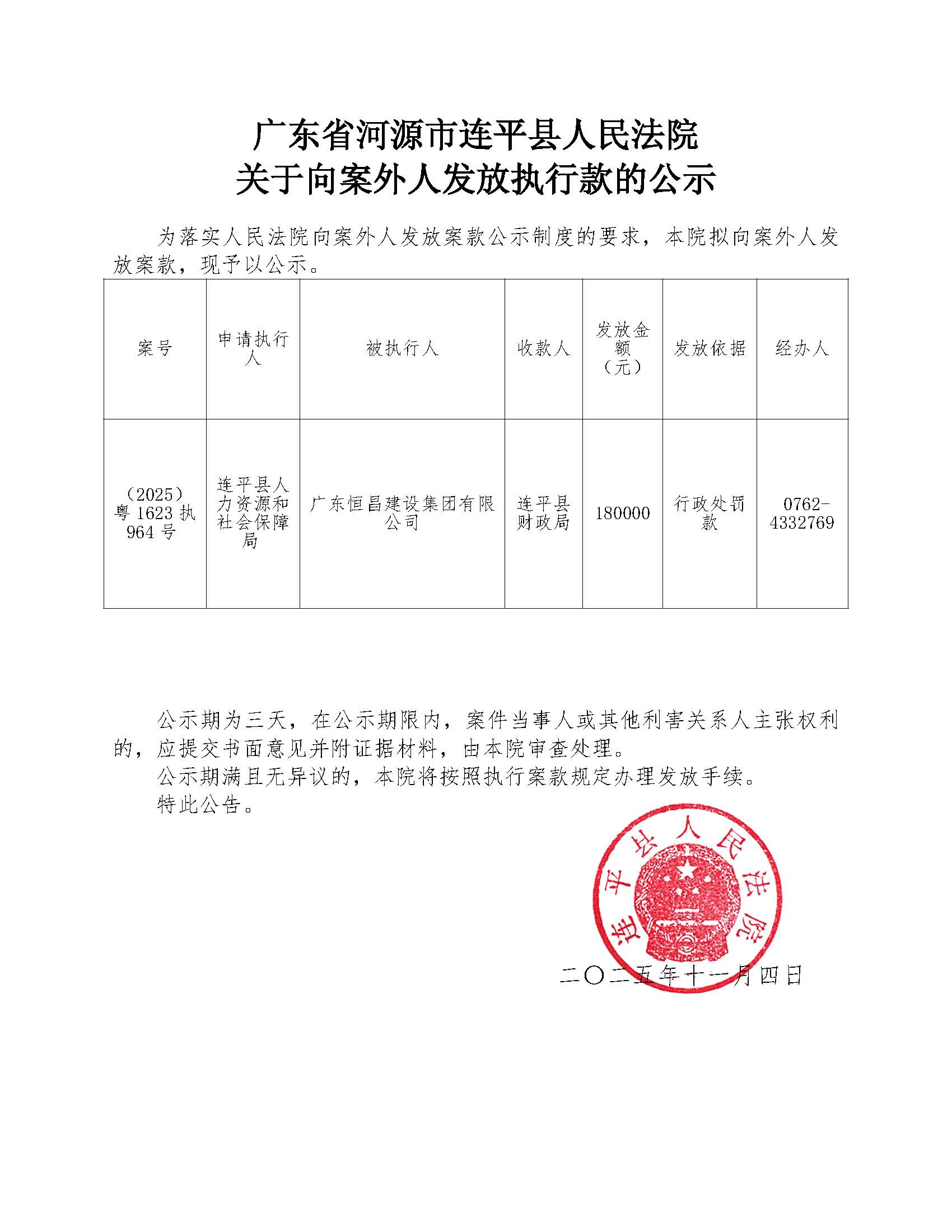 广东省河源市连平县人民法院关于向案外人发放执行款的公示11.4
