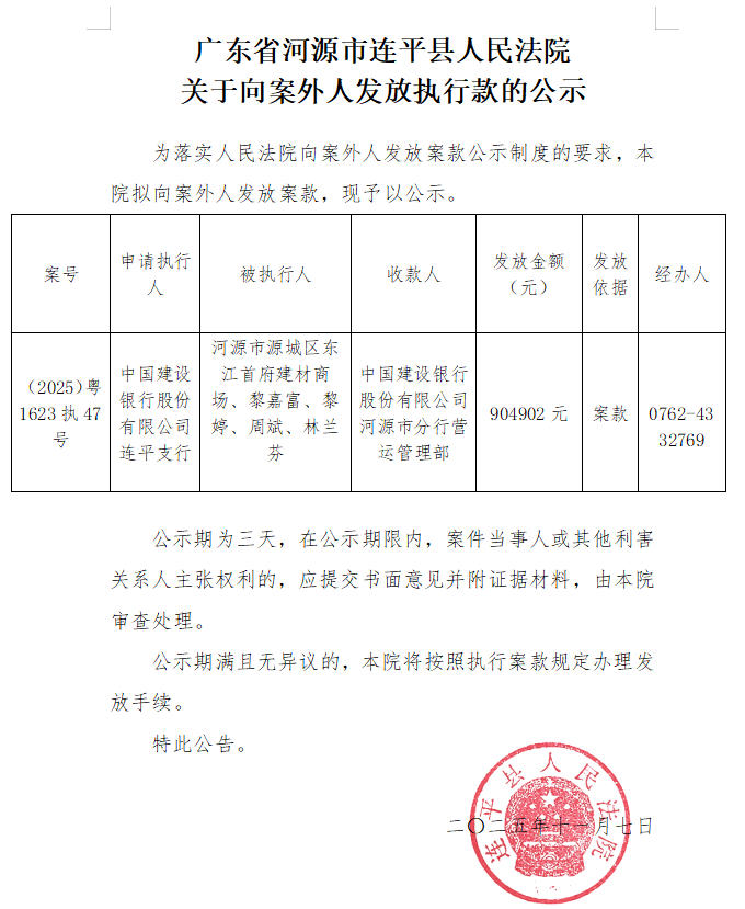 广东省河源市连平县人民法院关于向案外人发放执行款的公示11. 7