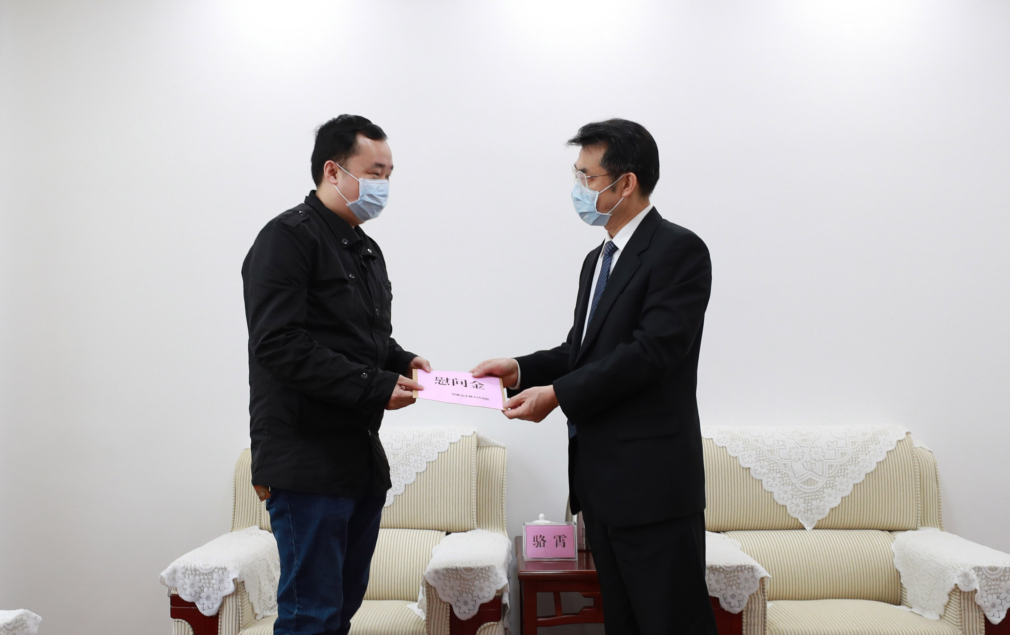 市人民医院内分泌科主任何金是我市第二批援助湖北医疗队的队长,其丈夫骆霄是市法院的一名干警。2月13日,市法院党组书记、院长周定挺代表院党组看望慰问了骆霄同志,对其及家人全力支持何金医生的工作表示感谢!并通过他对主动请战奔赴抗击疫情前线的何金医生致以崇高敬意!