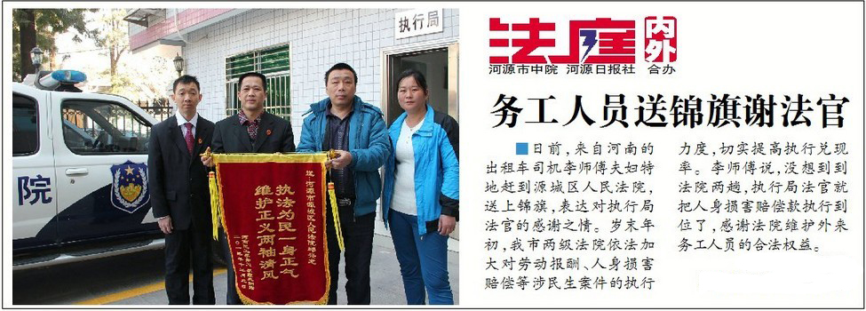 日前,来自河南的出租车司机李师傅夫妇特地赶到源城区人民法院,送上锦旗,表达对执行局法官的感谢之情。岁末年初,我市两级法院依法加大对劳动报酬、人身损害赔偿等涉民生案件的执行力度,切实提高执行兑现率。李师傅说,没想到到法院两趟,执行局法官就把人身损害赔偿款执行到位了,感谢法院维护外来务工人员的合法权益。