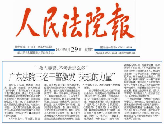 三名干警办案路上仗义出手引起社会热议。特别是在他们接受媒体采访时发出的“救人要紧,不考虑那么多”、“法官都不敢扶还有什么信任感”等言语更是得到了媒体和社会的广泛认同。《人民网》、《凤凰网》、《财经网》、《腾讯网》、《中国好人网》等多家网站对报道进行转载,并获网民“狂点赞”:这是扶起的力量、但愿好人一生平安……做好事,值得褒奖!特别在这个“扶与不扶”都要争论的时候,传播正能量,有何不可?5月22日,《人民法院报》在二版刊发的《摔倒的是老人,扶起的是道德》一文中这样写道:关键时刻见真情。法官扶起的岂止是老人,而是社会“跌倒的道德”……基于道德层面的救赎,离不开对人性和良知的坚守。呼唤更多的人心无芥蒂地对危难伸出援手,需要重塑社会风气与社会氛围。构建社会诚信体系,让助人不再是“高风险作业”,应该成为这个社会的起码的道德良知。