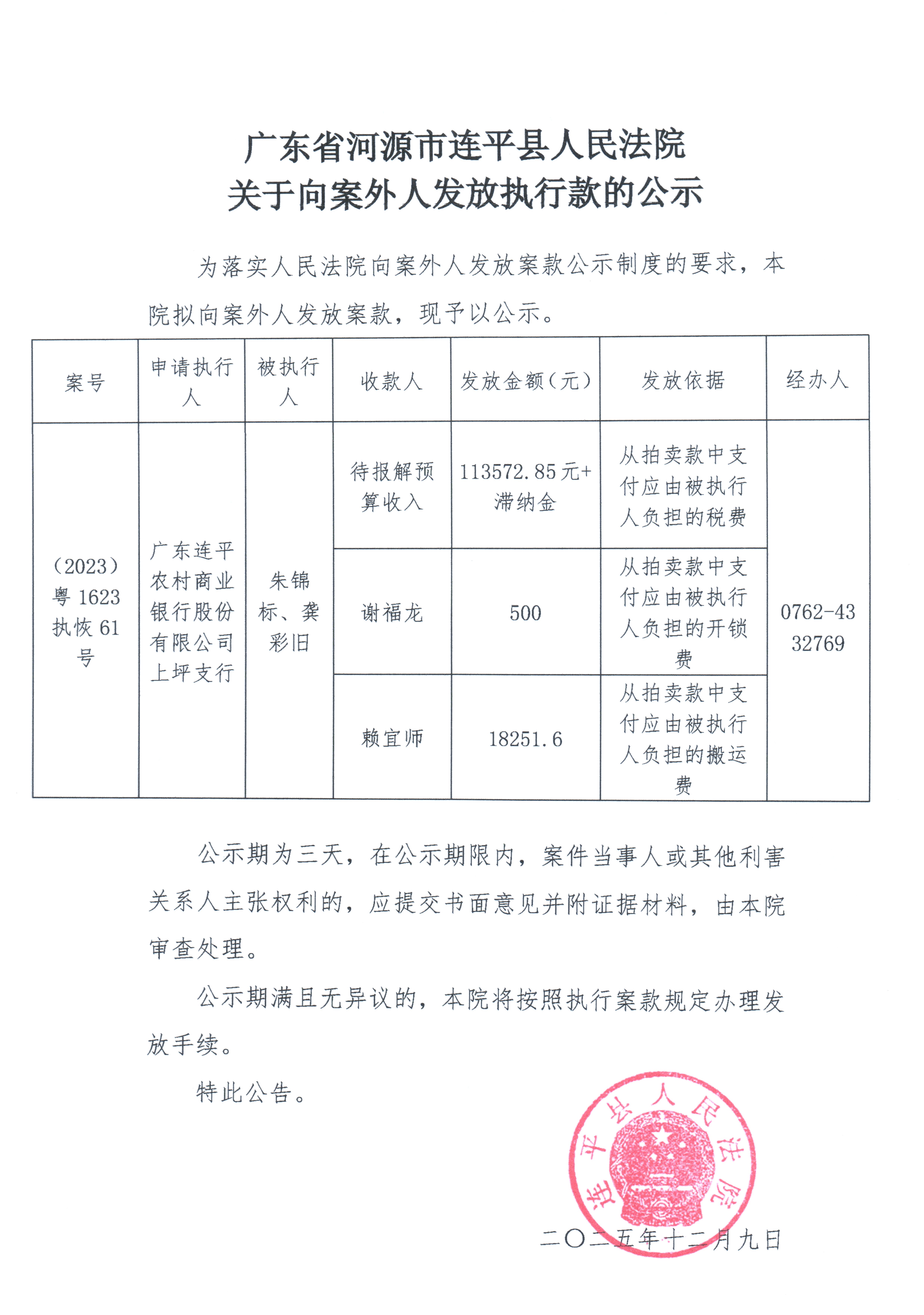 广东省河源市连平县人民法院关于向案外人发放执行案款的公示 12.9