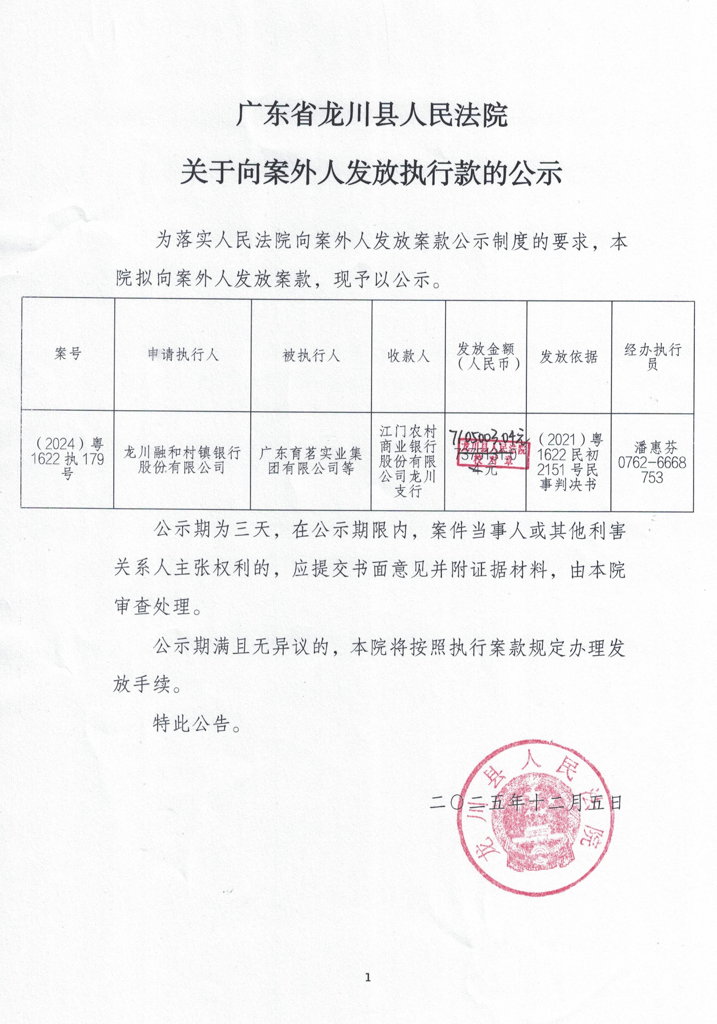 广东省河源市龙川县人民法院关于向案外人发放执行案款的公示12.5