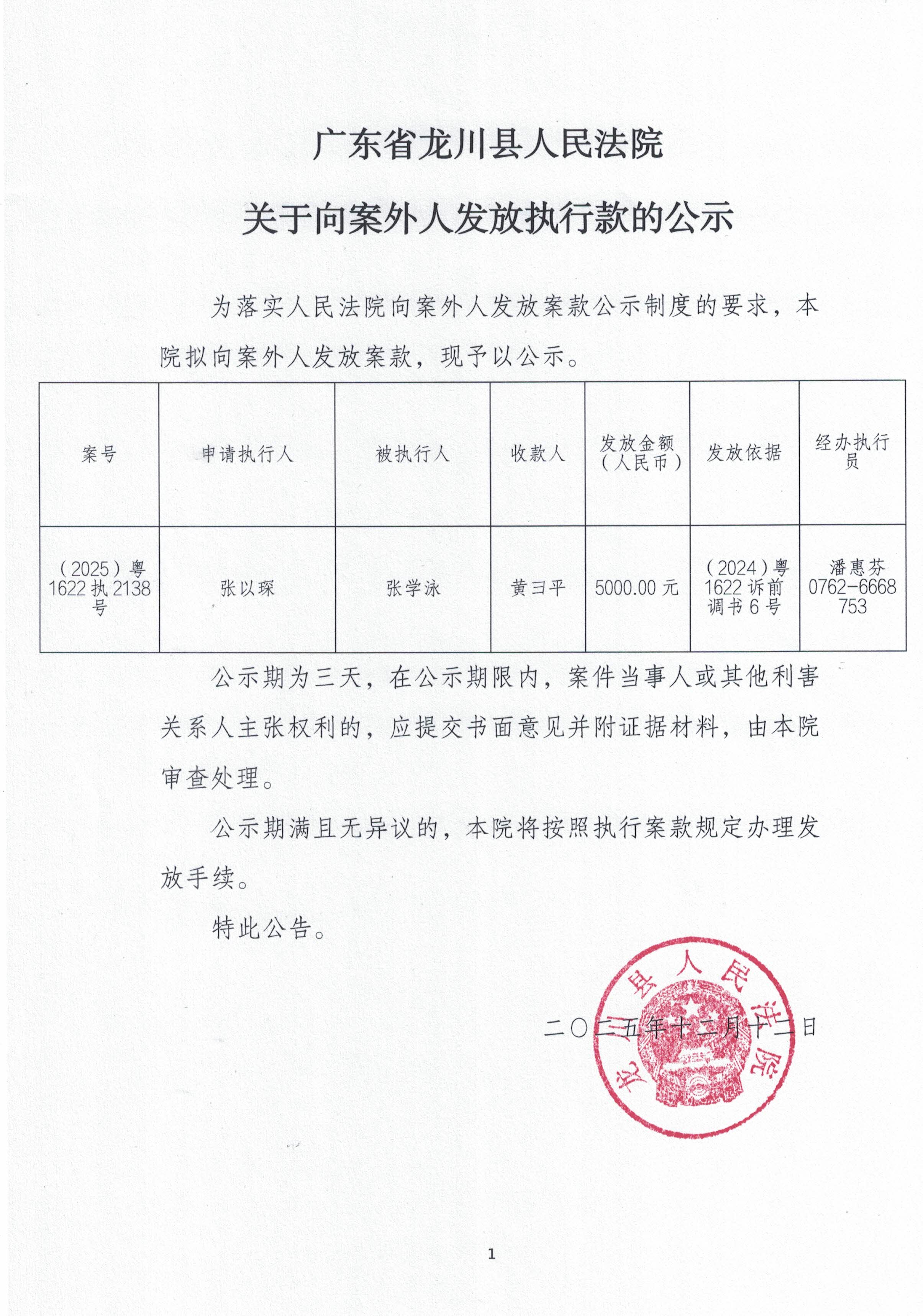 广东省河源市龙川县人民法院关于向案外人发放执行案款的公示12.12