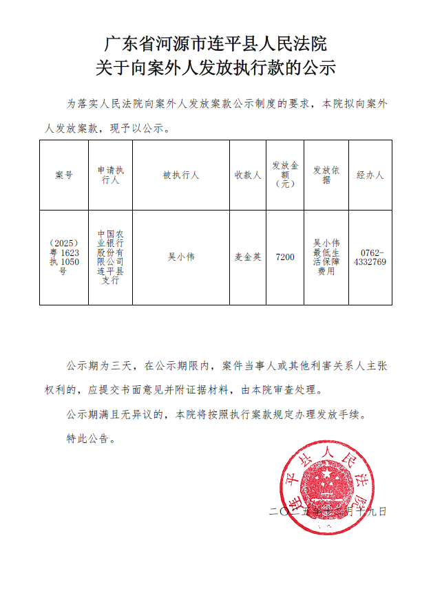 广东省河源市连平县人民法院关于向案外人发放执行款的公示12.19