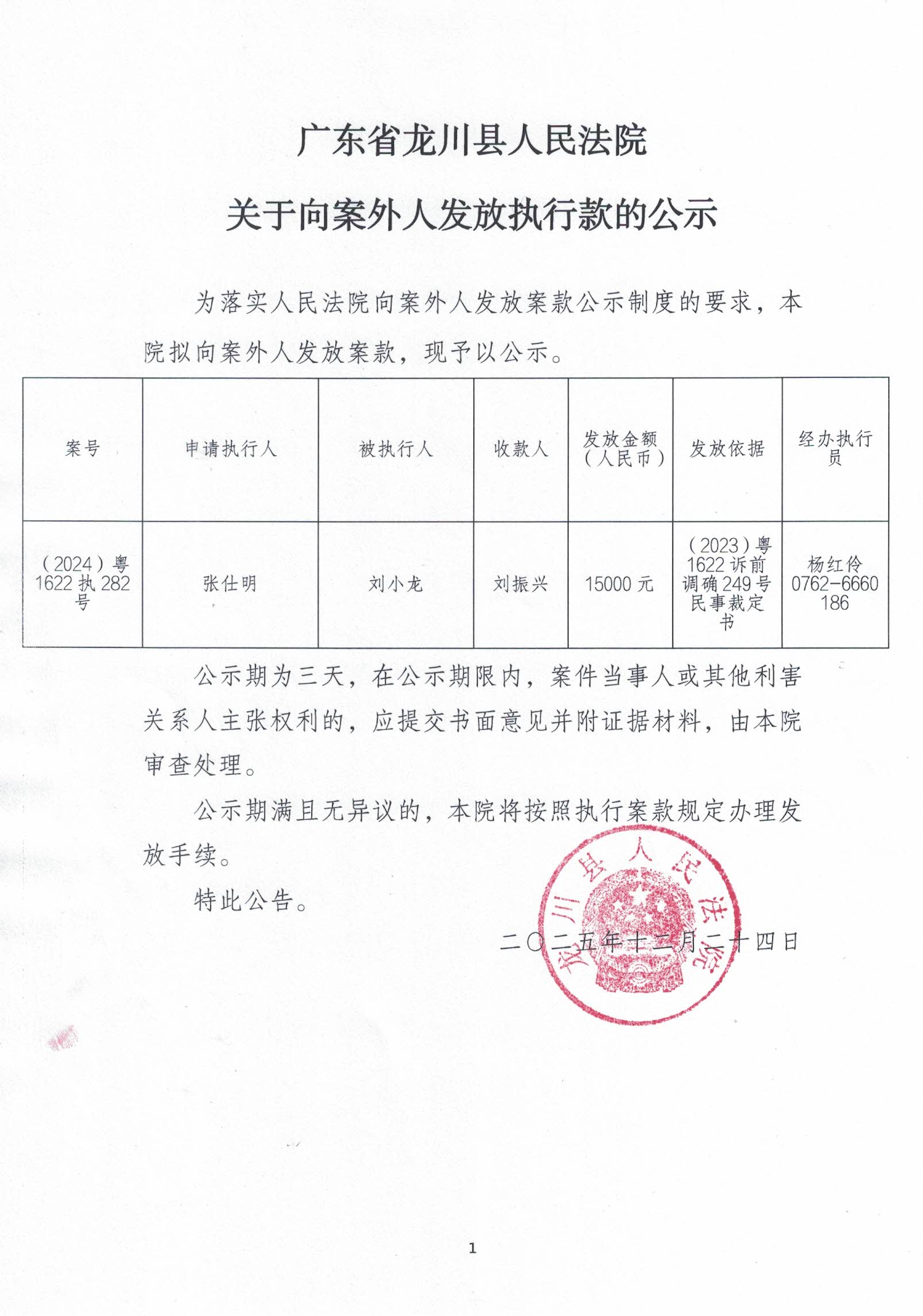 广东省河源市龙川县人民法院关于向案外人发放执行款的公示12.24