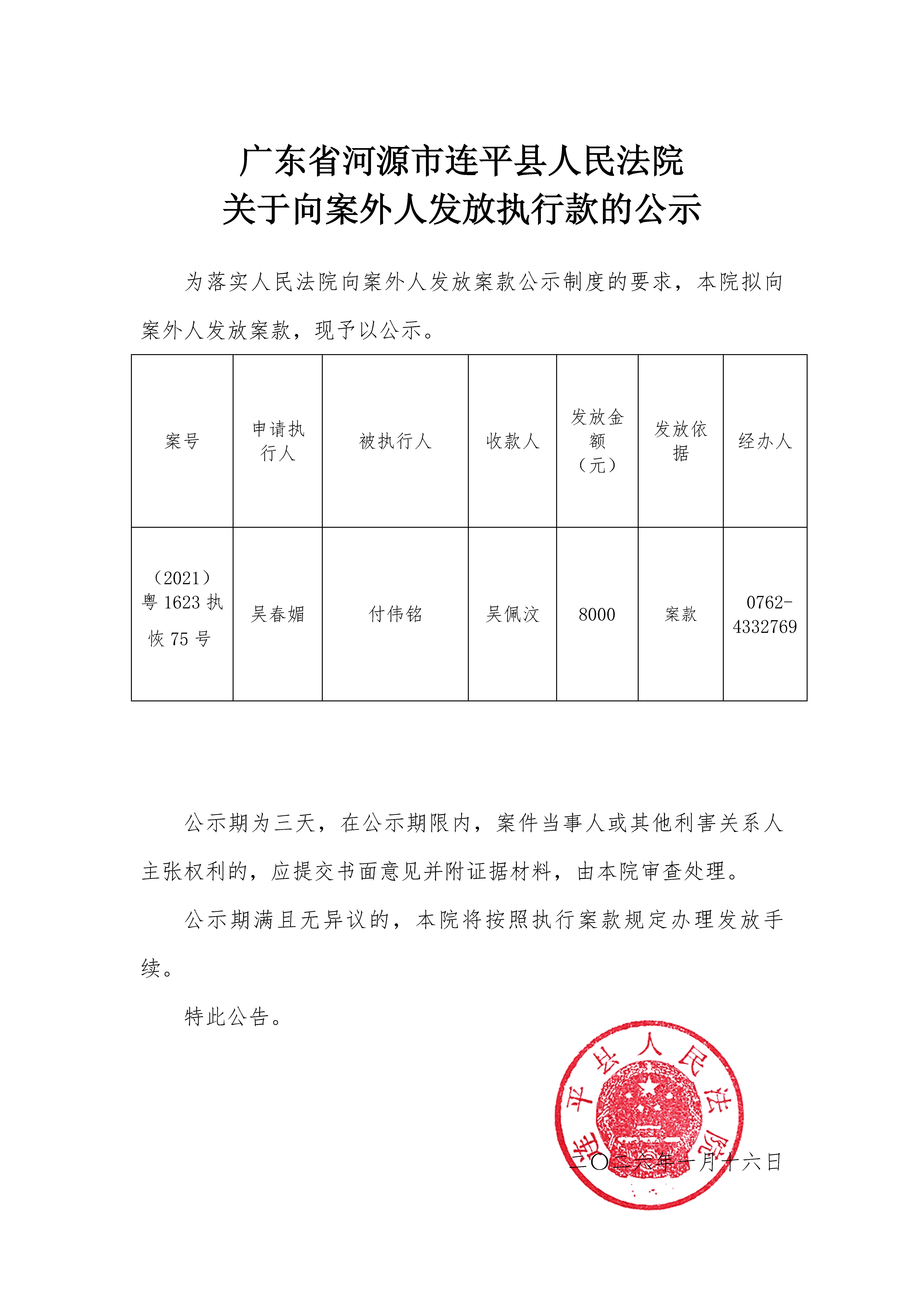 广东省连平县人民法院关于向案外人发放执行款的公示1.19