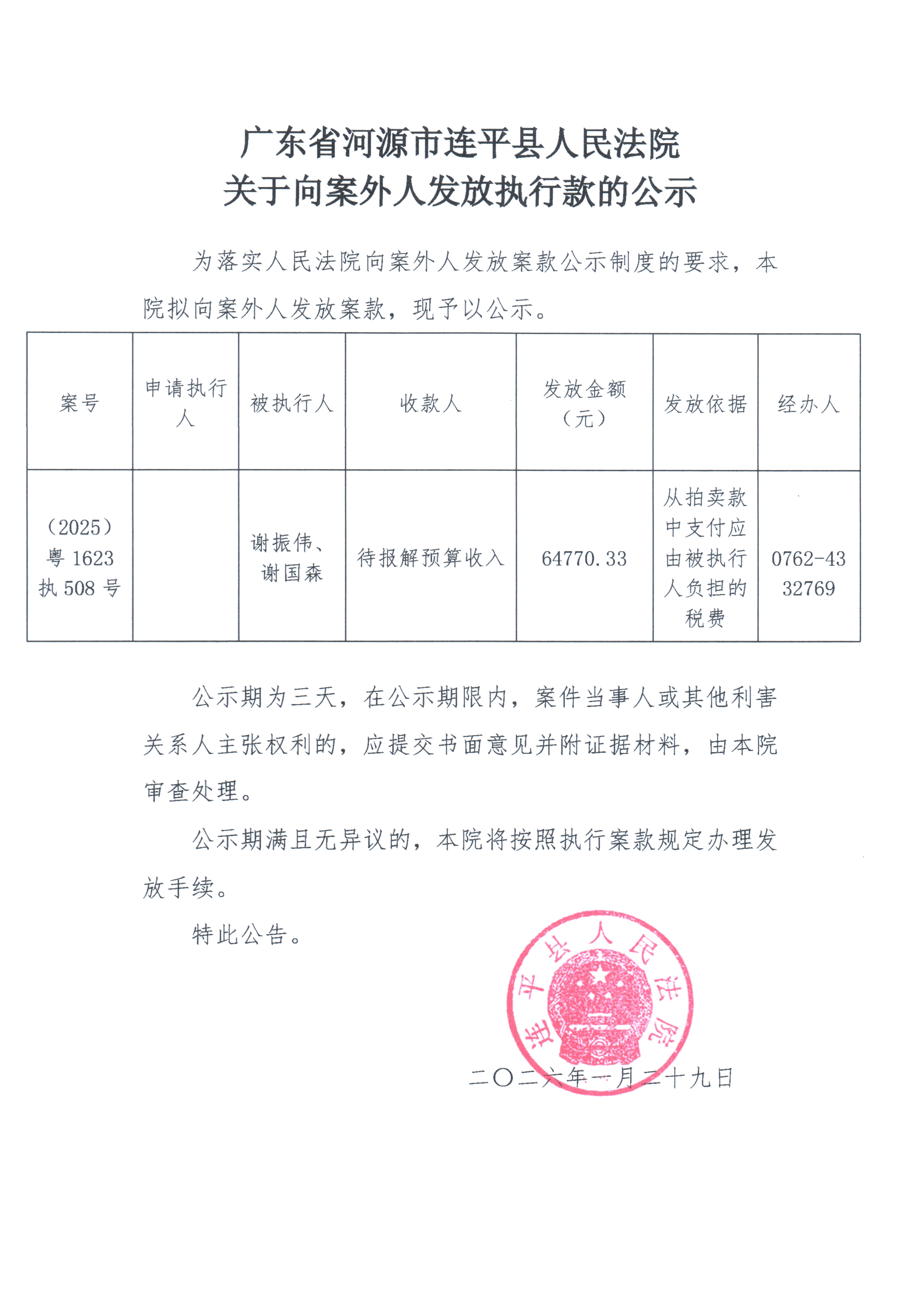 广东省连平县人民法院关于向案外人发放执行款的公示1.29