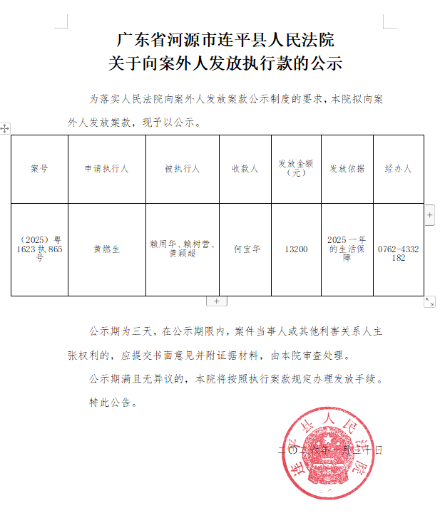 广东省连平县人民法院关于向案外人发放执行款的公示1.30