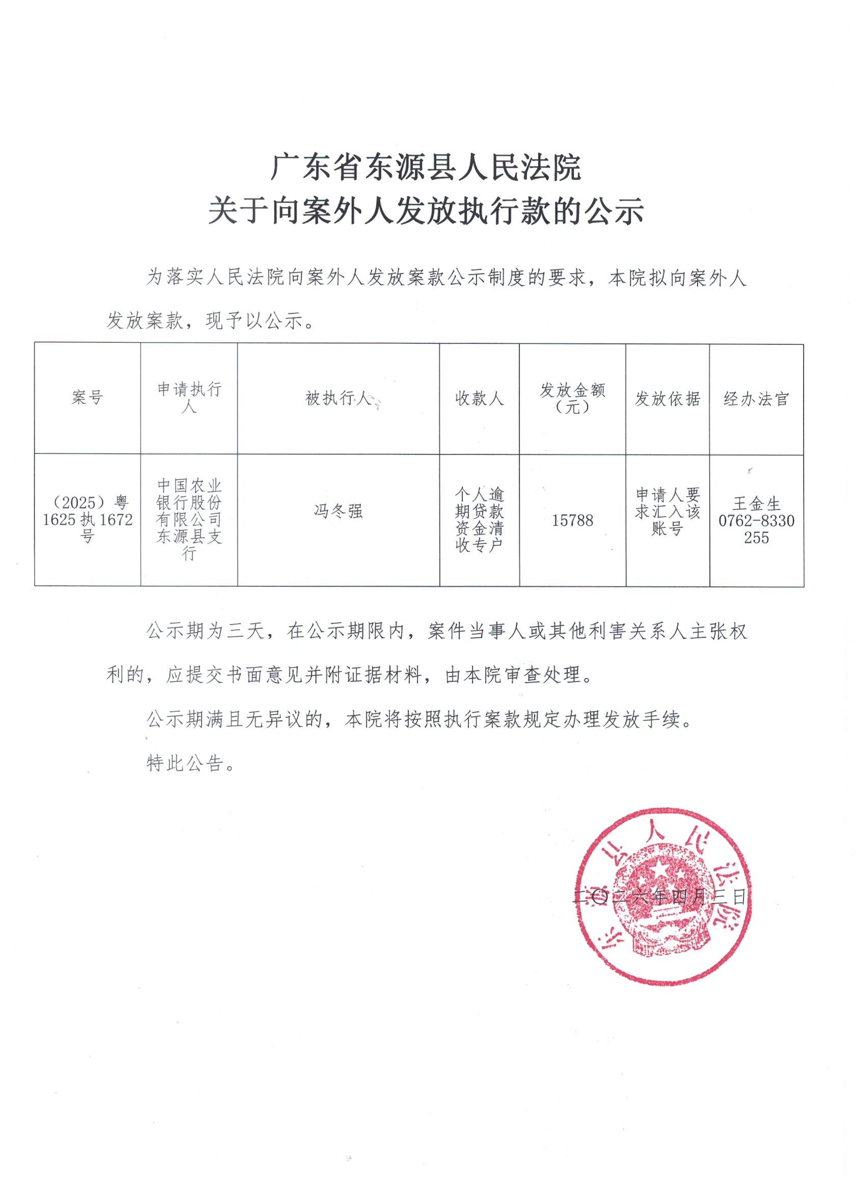 广东省东源县人民法院关于向案外人发放执行款的公示