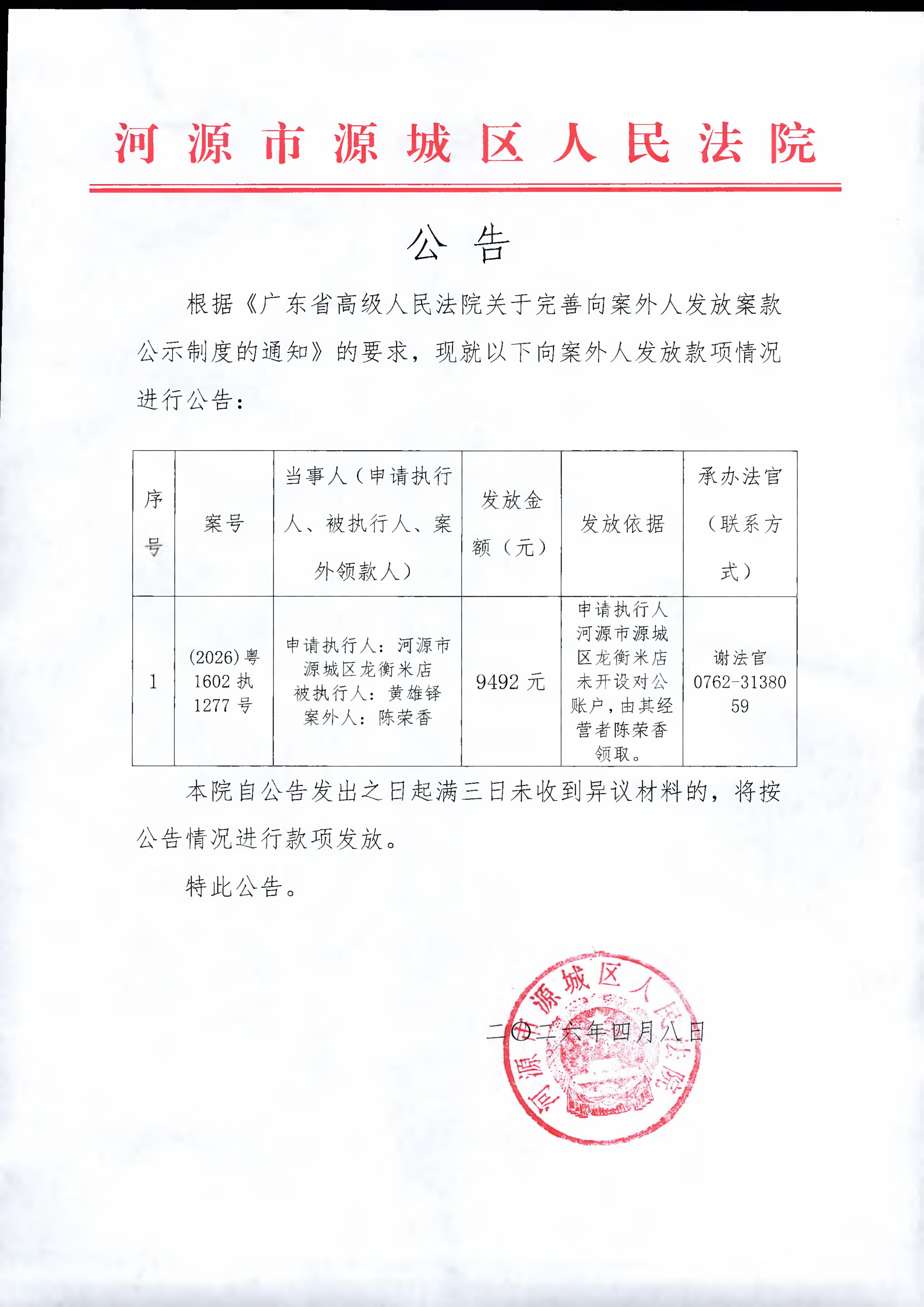 广东省河源市源城区人民法院关于向案外人发放执行款的公示