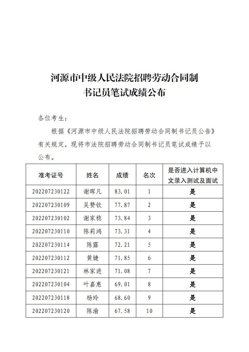 河源市中级人民法院2022年书记员招聘笔试成绩公布