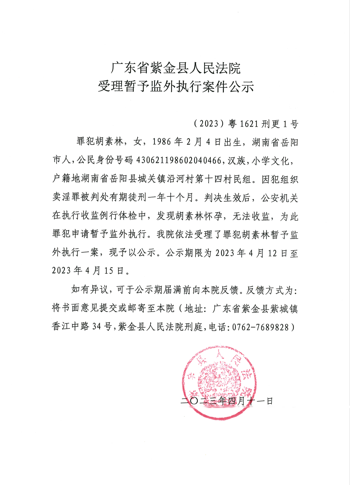紫金县人民法院受理胡素林暂予监外执行案件公示