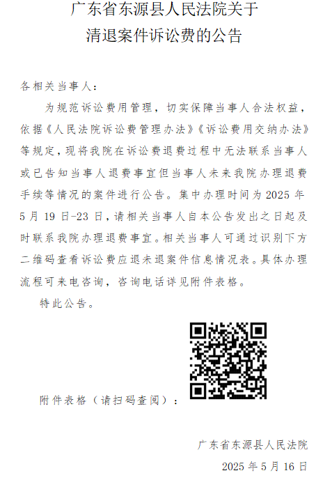 广东省东源县人民法院关于清退案件诉讼费的公告