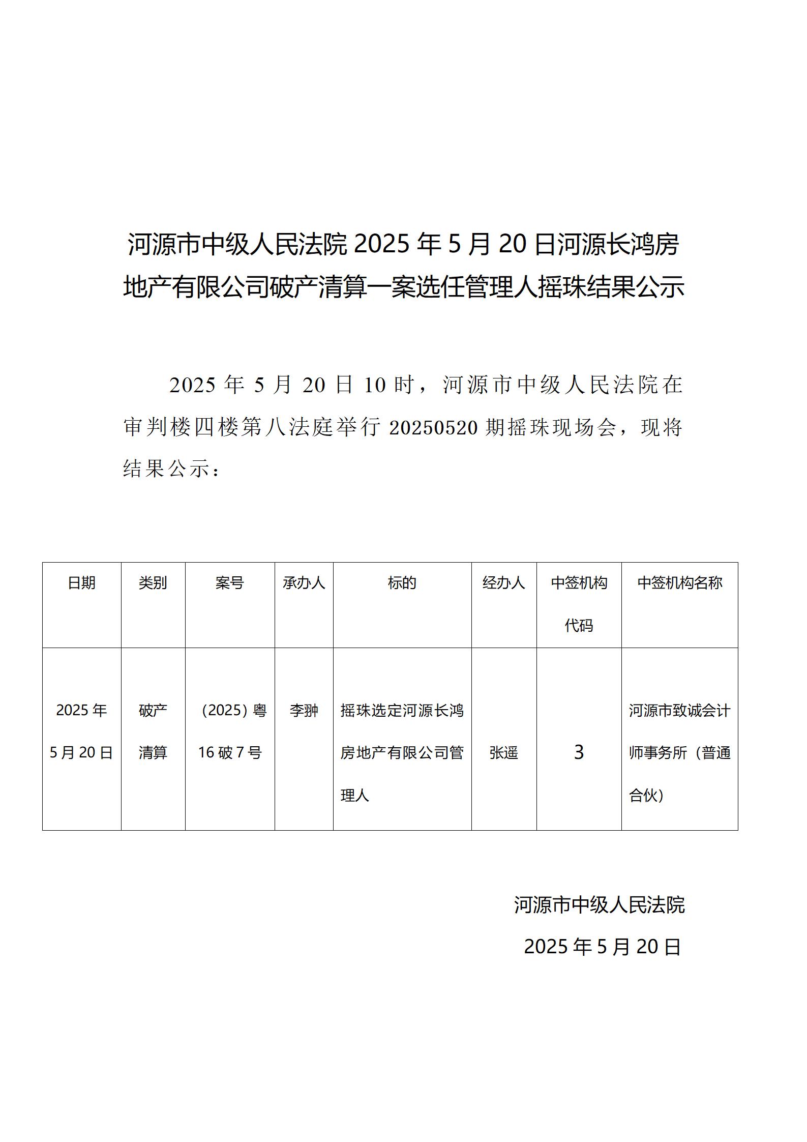 河源长鸿房地产有限公司破产清算一案选任管理人摇珠结果公示