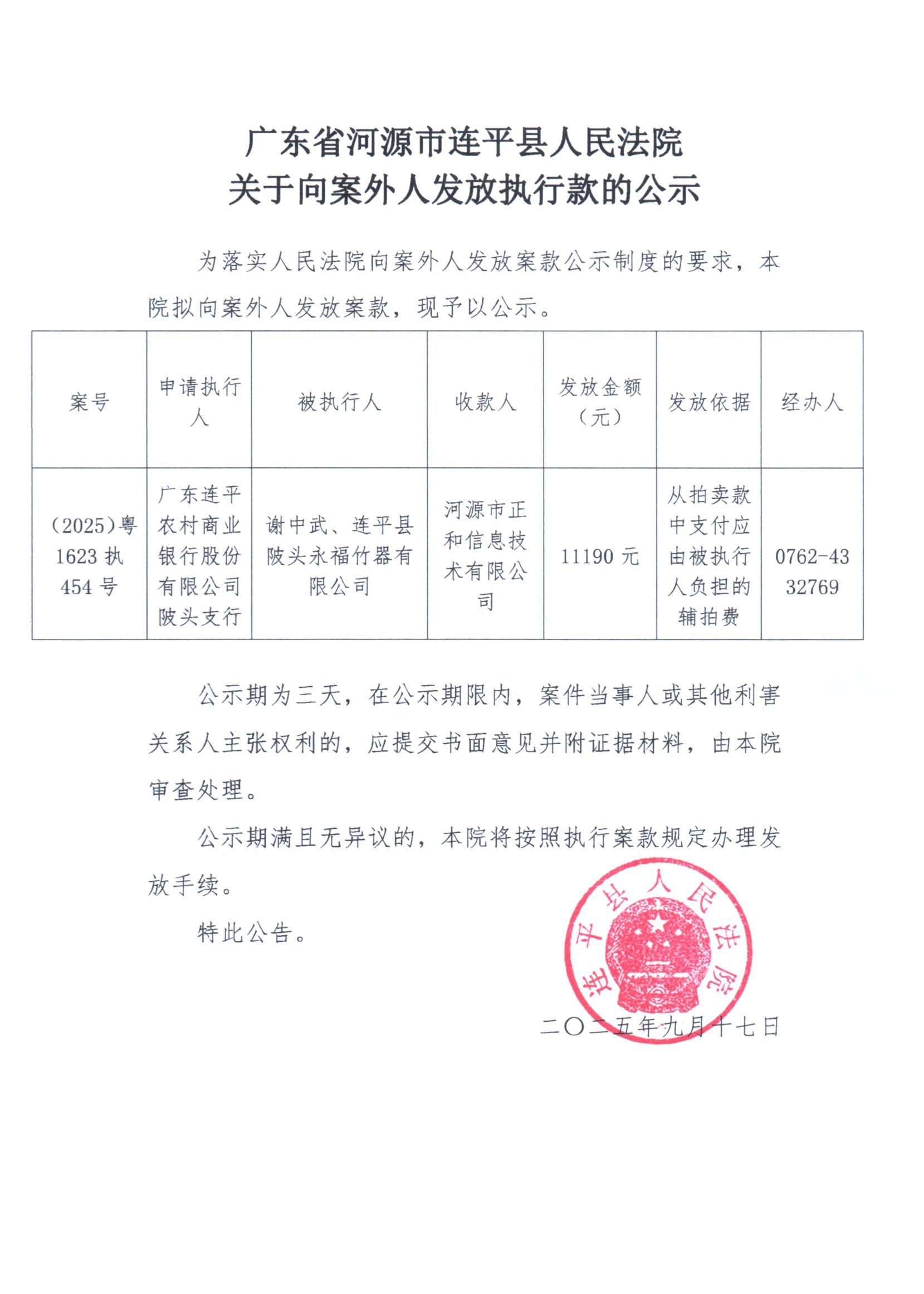 广东省河源市连平县人民法院关于向案外人发放执行款的公示9.17