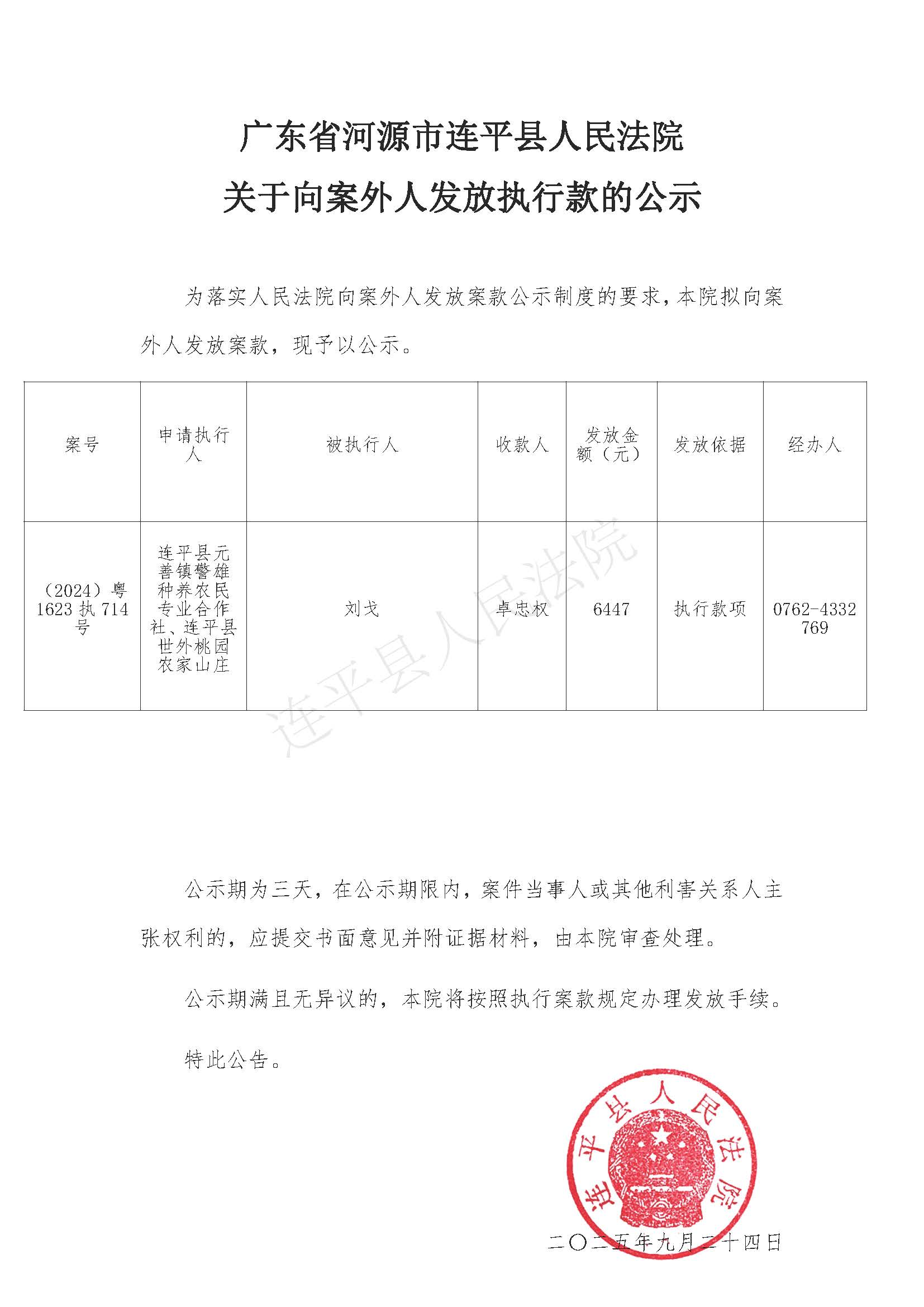 广东省河源市连平县人民法院关于向案外人发放执行款的公示9.25